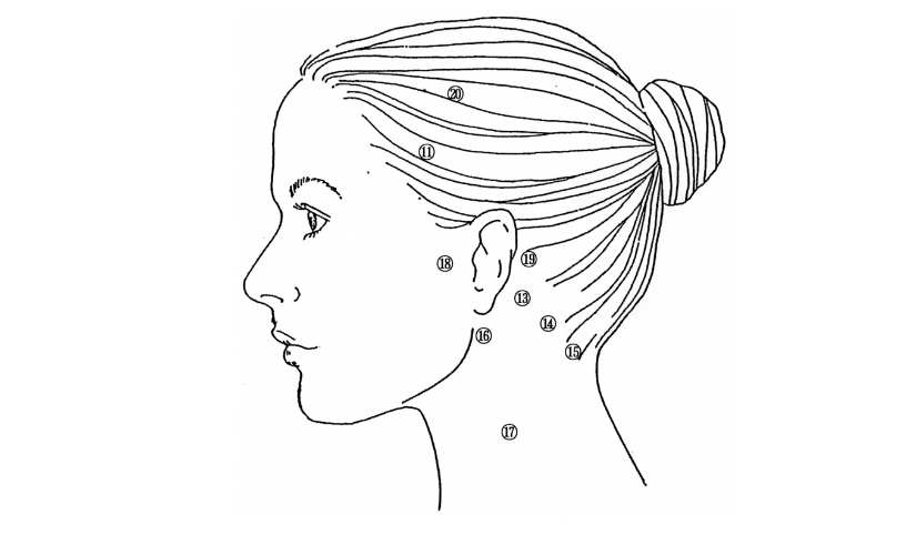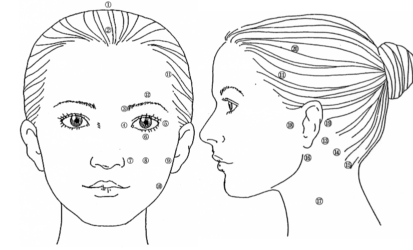 耳鳴りや難聴などの耳の疾患に対してハリ灸が効果的な場合があります。この場合も首の緊張が強く、頭の耳の周りの部分もスジ張っケースが多く見られます。やはり首の治療も欠かせません。首の13.14.15.17、耳の周りの16.18.19、頭の11、20も必要です。この他、耳や17周囲にはツボが多くあり、その周囲全体の緊張緩和が必要です。マッサージであれば耳の周囲に限らず、頭・側頚部全体をマッサージします。