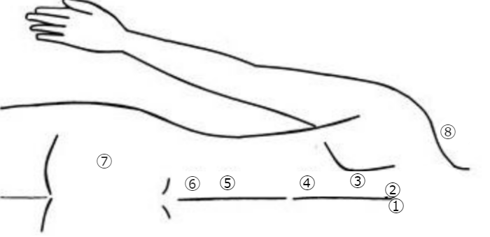 ①は小児の「夜泣き」「疳の虫」封じのツボとして有名で、精神作用と関係が深い場所です。不眠・頻繁に目が覚める、夢見が多く寝た気にならないなどの時は、この付近が硬く緊張している事が多いと言えます。②や③付近まで緊張が及びます。頚と並んでストレス反応が出やすい場所と言えます。
