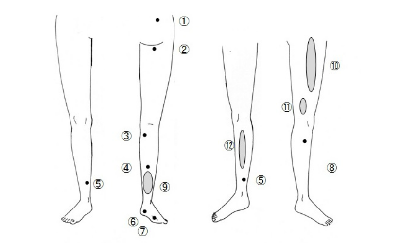 ③委中(膝裏の窪み中央) ④承筋(ふくらはぎの真ん中)