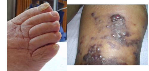 皮膚がカサつき、乾燥肌のように粉をふいた状態や皮膚が細かい状態で(フケ状)浮いてボロボロとはがれてきます。更に皮膚がぶ厚く、硬くなり、時にはかかとの皮膚のようにガサつきます。関節部分のヒダは深くなりデコボコした状態が見られます。手や足は赤ちゃんの様に、ふっくらとした甲のふくらみから指や趾が突き出て見えます。