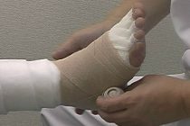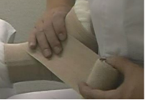 *弾性包帯・テーピングのコツは圧力のデコボコを作らない事です。むくみは圧力の低い部分に集まってくるからです。また、圧力をかけようとして引張りすぎてないことです。無理なテーピングは時間が経つと苦しくなり、シワがよることで皮膚を傷つけることもあります。シワの少ない滑らかで心地よいテーピングを心がけましょう。